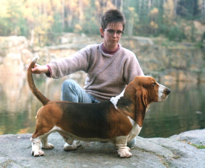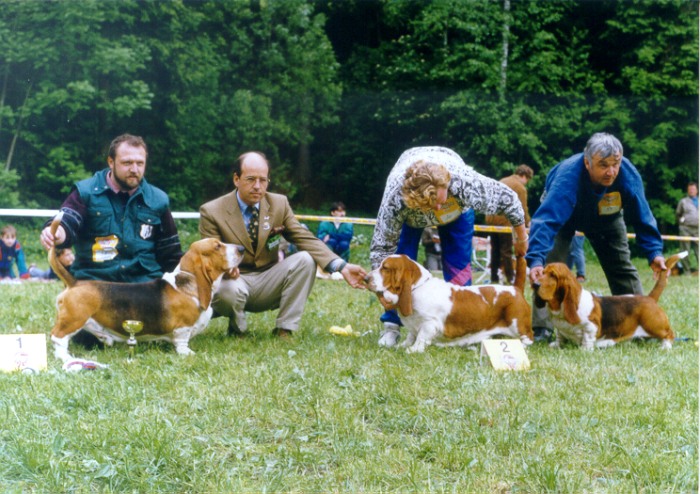 KLUBOVÁ VÝSTAVA BASSET KLUBU ČR 1997, třída šampionů - zleva: v1 CAC DINO BOHEMIA HORRIDO, v2,r.CAC BELVEDER A v3 EBONY DOMINIK ROZHODČÍ: JOSÉ HOMEM DE MELLO, Portugalsko.
